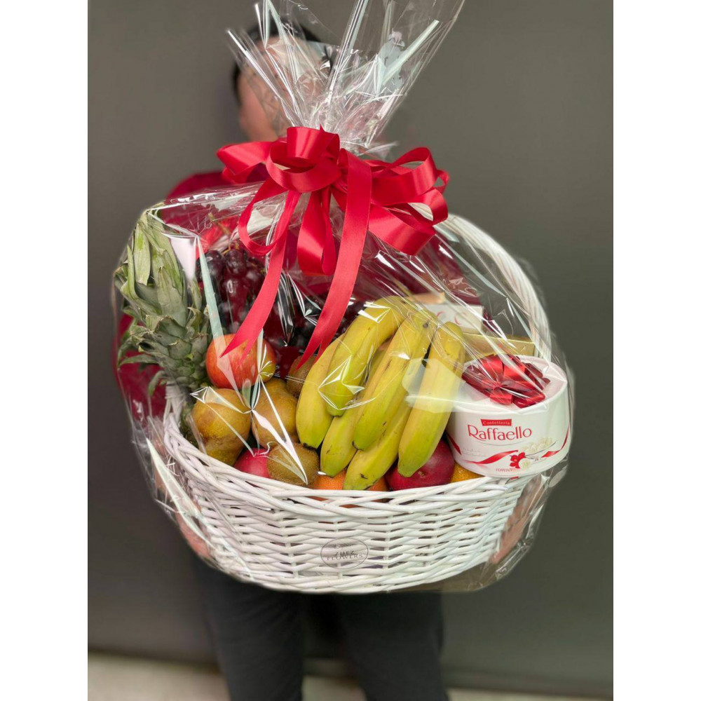 Состав Корзины : виноград, ананас, груши и яблоки в изысканном оформлении. Корзинку можно взять с собой на пикник, а также украсить праздничный стол. Доставка круглосуточная по всему городу… А наш ценовой ряд позволит вам наслаждаться встречей без лишних сомнений.